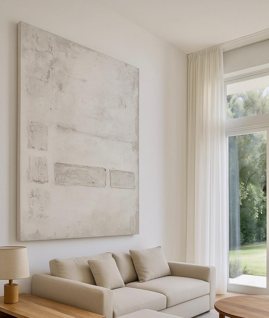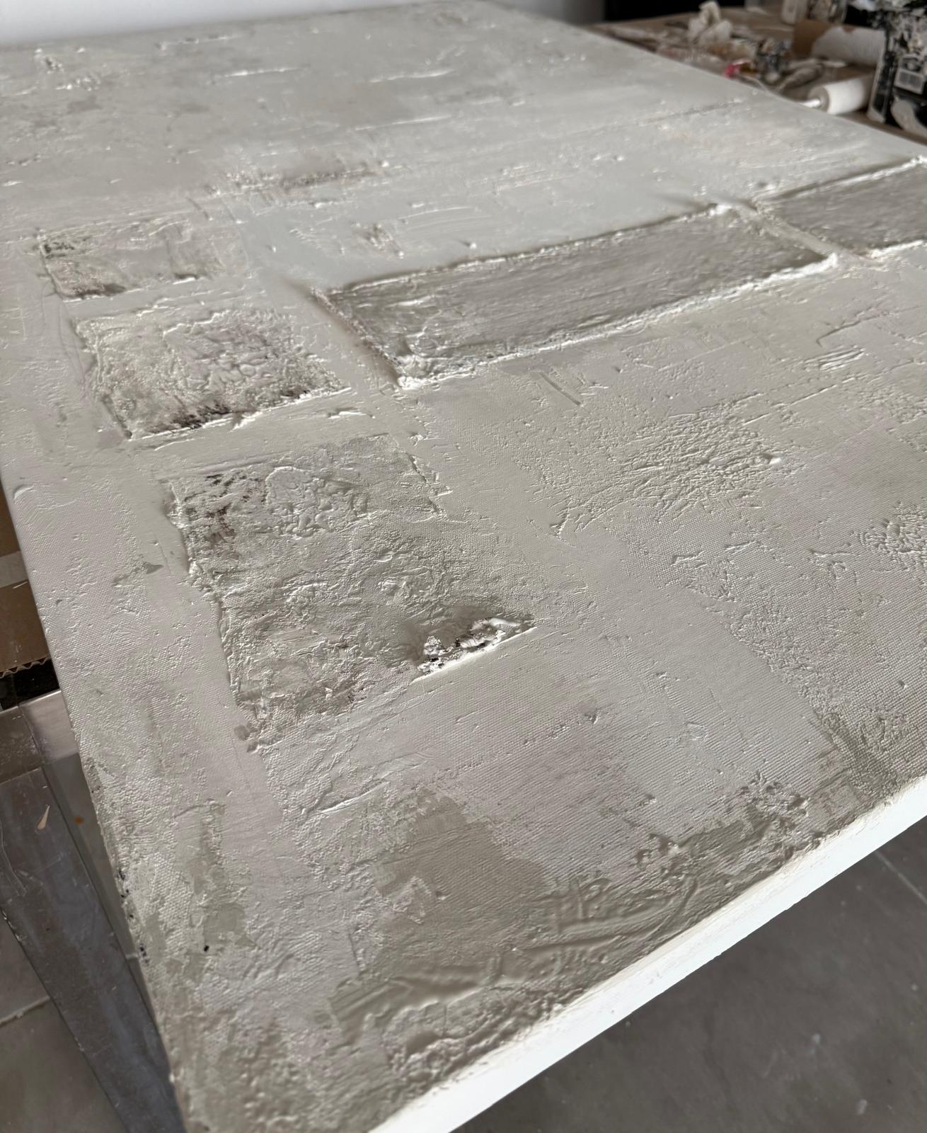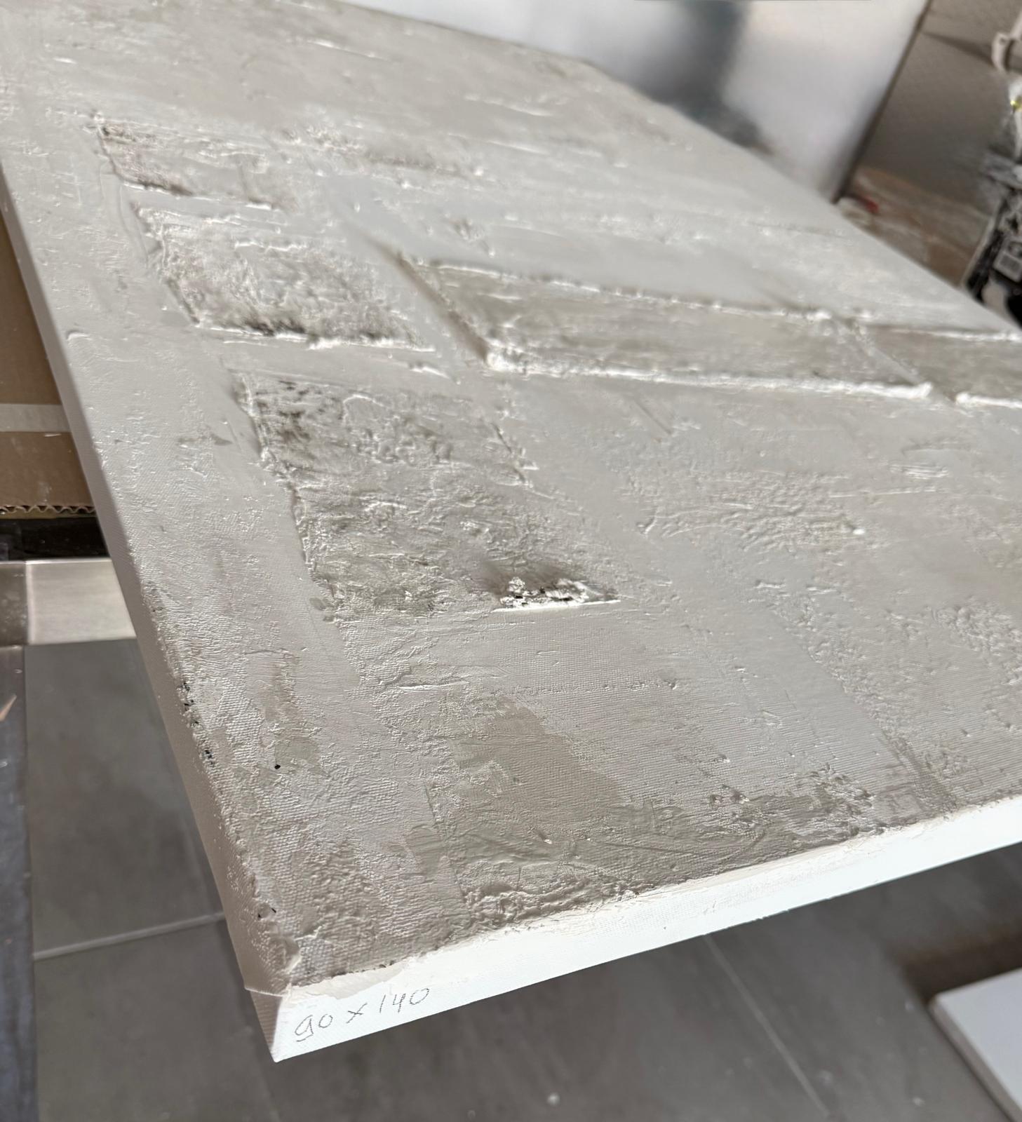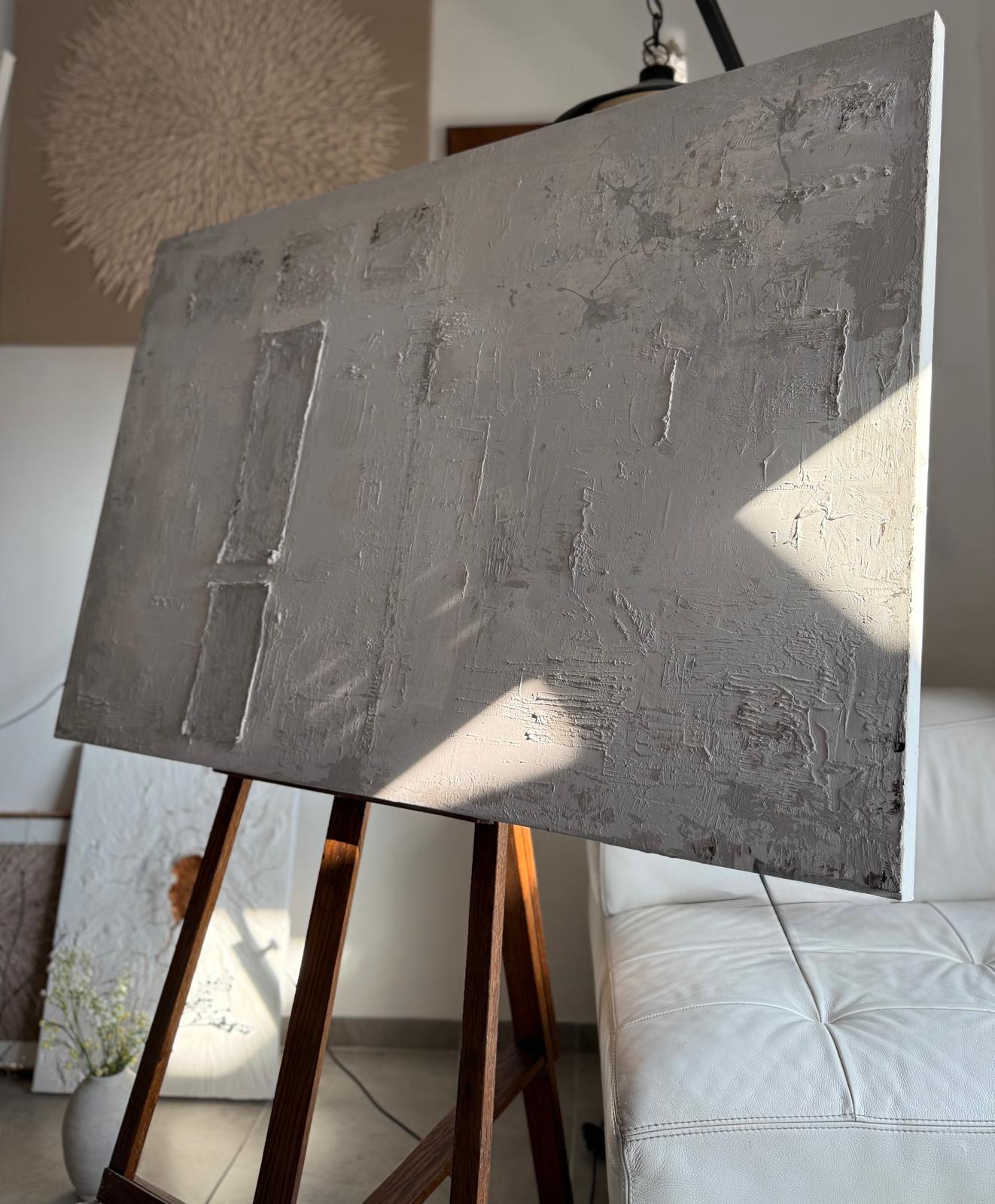 מדיה: מיקס מדיה-אקריל בגווני ב’ז בהיר, אפור בהיר, גוון לבן אופוויט ,גוון פשתן עם טקסטורה מובלטת וטקסטיל , על 100% בד קנבס איכותי, מתוח על מסגרת עץ, מוכן לתלייה